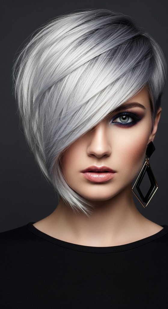 For a modern edge, try an asymmetrical pixie with longer side-swept pieces and shorter opposite sides. Add icy platinum highlights or silvery balayage to create a frosted effect that’s bold yet graceful.