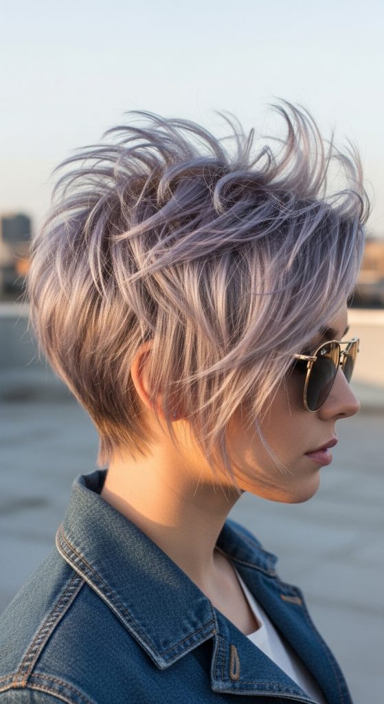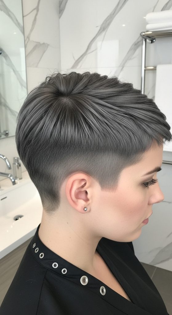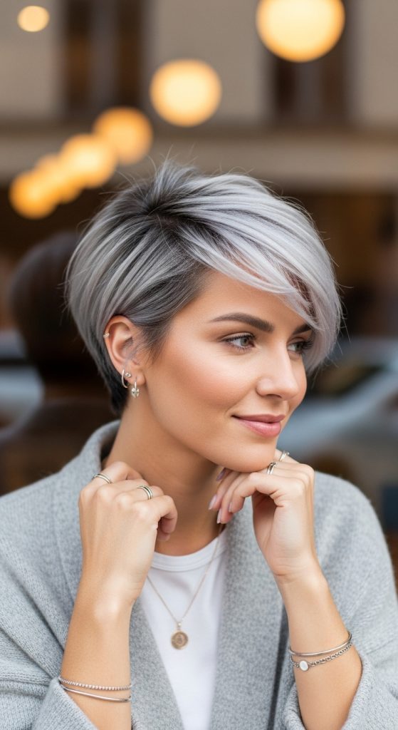 Gray roots don’t have to be hidden—they can be celebrated. A pixie cut with soft, grown-out roots paired with lighter silver ends looks intentionally stylish and dimensional. This is especially popular with the “gray blending” trend.
