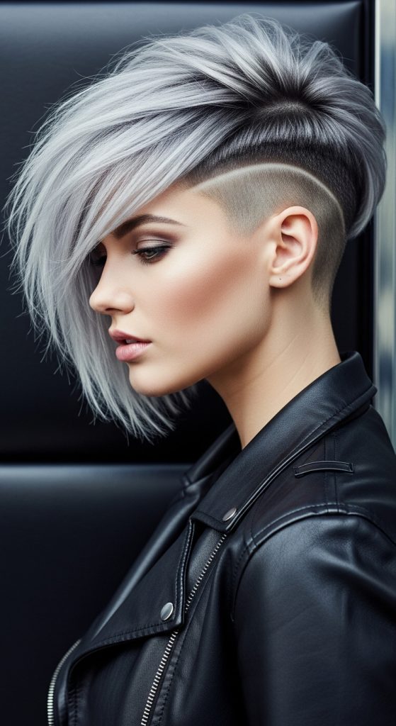 If you love a bold, contemporary look, try an undercut pixie. Keep the top long and voluminous, while the sides and nape are shaved or buzzed close. This style looks amazing with a silver ombré or dark-to-light gray fade.