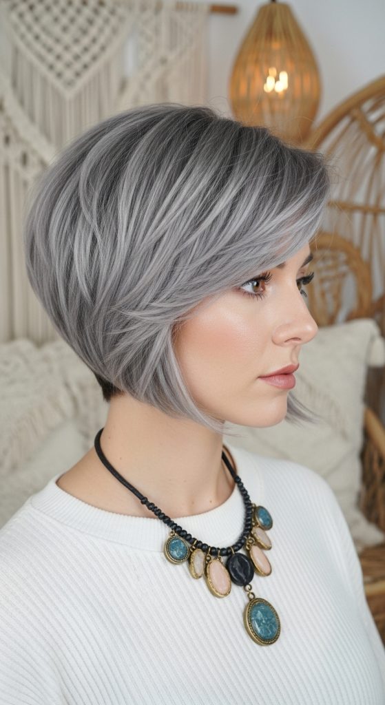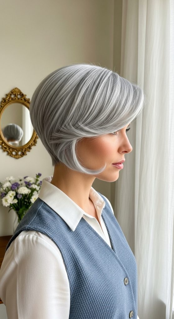Can’t decide between short and not-so-short? The pixie bob blends the best of both worlds. With longer layers that brush the jawline and shorter nape, it’s the ideal cut for transitioning into full gray without going ultra-short.