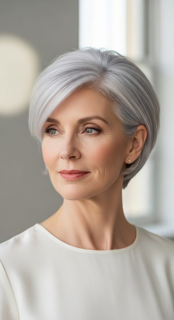Soft, side-swept bangs paired with a cropped cut create a romantic, feminine version of the pixie. It’s graceful yet bold, and it’s especially stunning with icy white or silver tones.