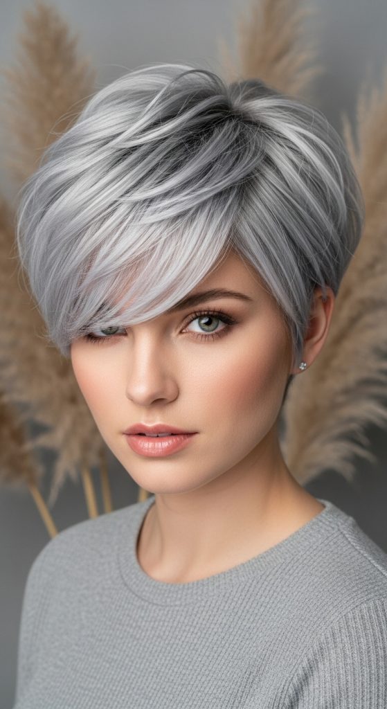 ✂️ 3. Side-Swept Bangs on an Icy Gray Pixie